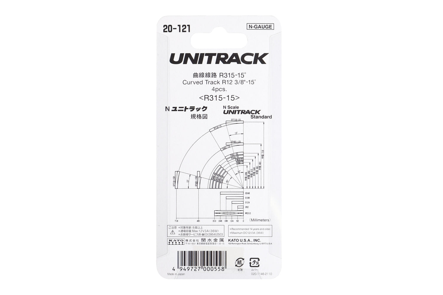 Kato 20-121 N R315-15 Curved Track (4 ea) (12 3/8-15d) N11459